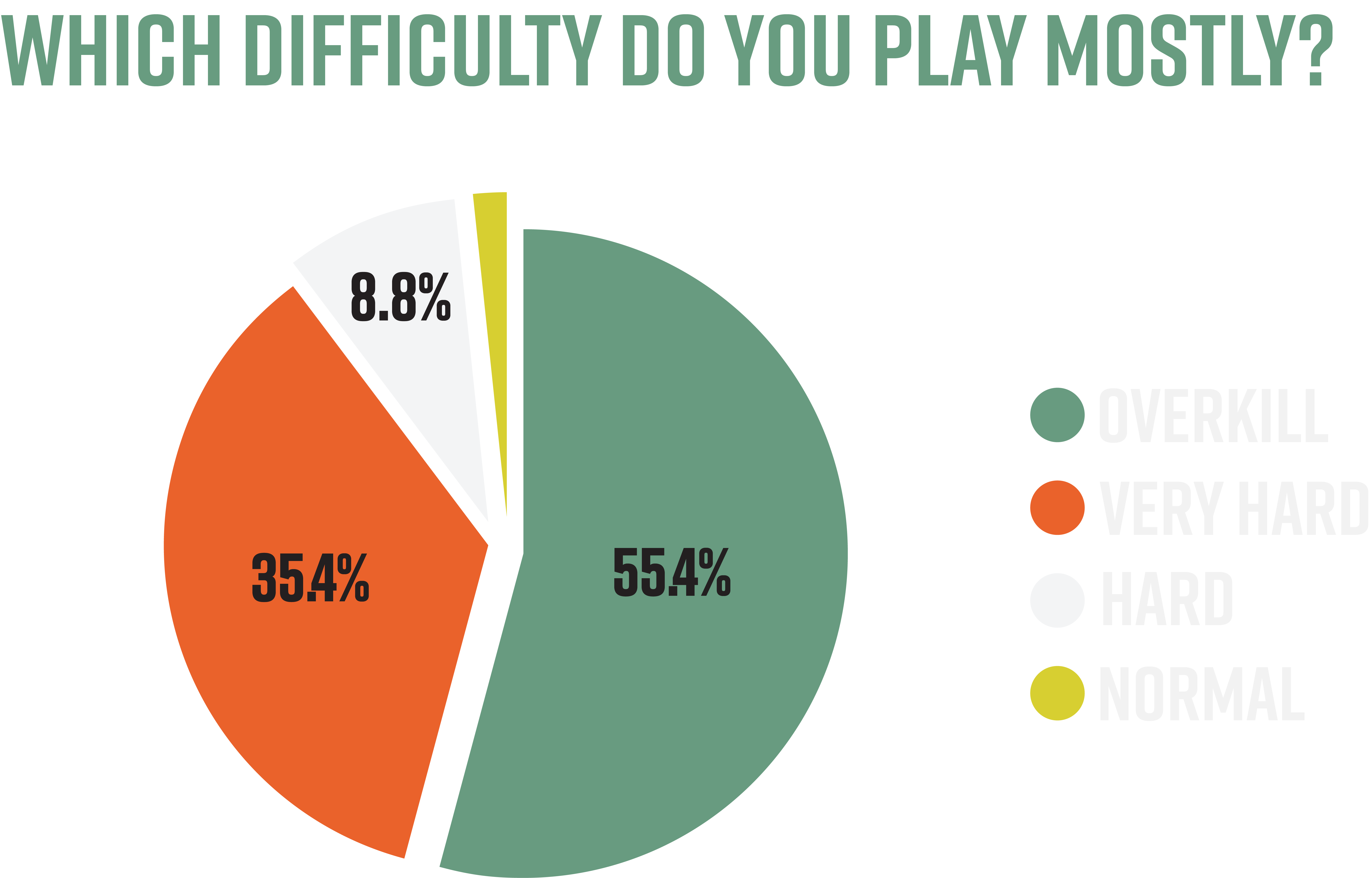To no one’s surprise the majority are playing on Overkill difficulty, with Very Hard coming in second. Meaning that of those who responded there is a clear winner on how you’d like your heists to go.